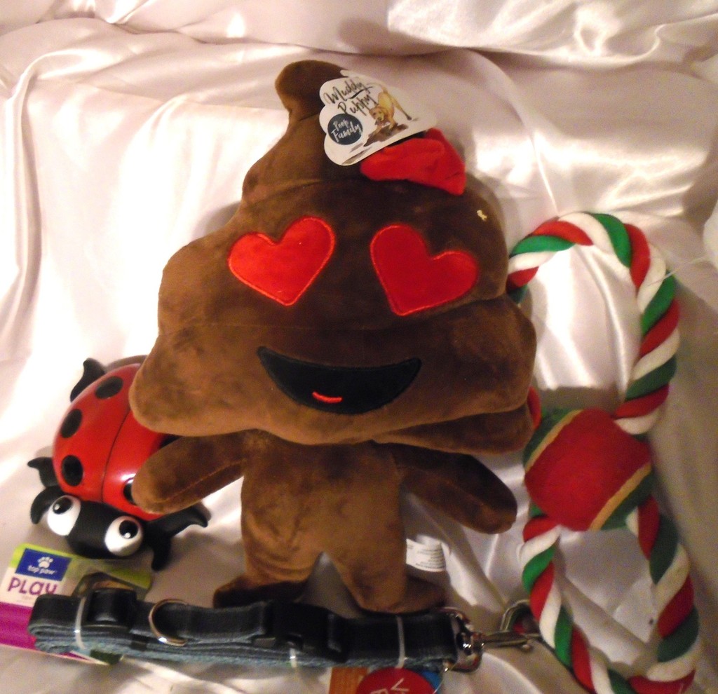 This bag of dog toys has a soft chewy toy, a squeaky lady bug toy and a tuggie toy....there is a leash included just in case you want to play with these things outside....