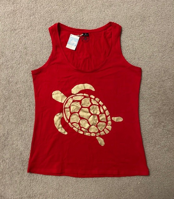 Turtle Love! New with tags - Adorable RED Tank Top with a gold Foil Turtle on the front. Size "Women's Medium". Machine Washable, stylish scoop-neck design (and long enough to be tucked in - or worn casually loose). Wear on the beach, boat, or anywhere. Cotton-blend for extra comfort. 95% Cotton, 5% Spandex - size is 10.8"L and 10" W. Available for shipping nationwide to Winner (with insurance) and can be picked up for FREE in Enfield, CT after the Auction.