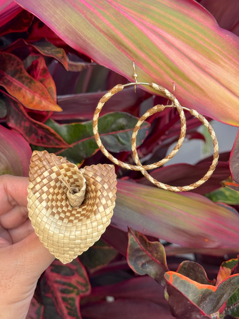 Earrings are handmade, gold-filled hoops (2.25?), wrapped anoni style with light and dark lau. Anthurium is also anoni style, made to wear in your ear or hair. Lau was harvested in Keaukaha and Wailupe, Hawaii.