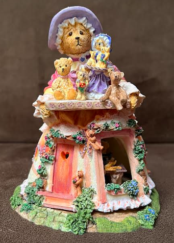 "Hattie ? The Bear Peddler" depicts a mother bear dressed in ruffles and a shawl, holding a tray full of bear toys and dolls. Her skirt forms the dwelling, and another bear inside sits working at a sewing machine. "Street peddlers were a common sight, as many Housemothers tended to be homebodies and preferred the shops to come to them."