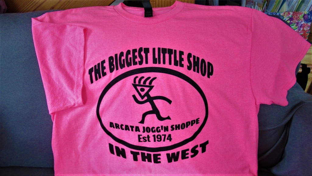 This fun salmon pink, 50/50 cotton-polyester Gildan Heavy Cotton unisex large t-shirt is ready for action! The durable yet comfortable blend is perfect for everyday wear. Donated by the Arcata Jogg'n Shoppe, AKA "The Biggest Little Shop in the West Est 1974", the front features a black print of their unique jogg'n person logo, making it a stylish way to support a local business.