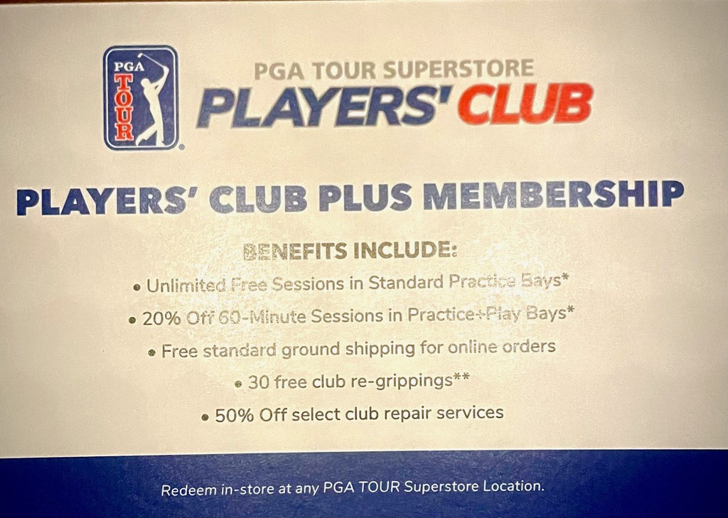 A one-year membership to the PGA Tour Superstore Players Club. This includes a three pack of lessons and free use of a golf simulator bay (once daily). The membership begins when activiated.