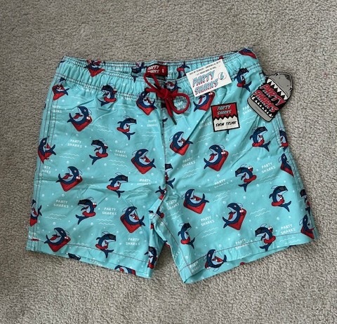 This item is BLUE, in "ADULT SIZE MEDIUM".  It's a NEW "Party Sharks" brand Bathing Suit / Swim Trunks.  Quick-dry technology, mesh lining, rear pocket with adhesive velcro to keep closed.  Available for nationwide bidding.  Item can be shipped to Winning Bidder or picked up for FREE in Enfield, CT after the Auction.  Fun style, great fit!