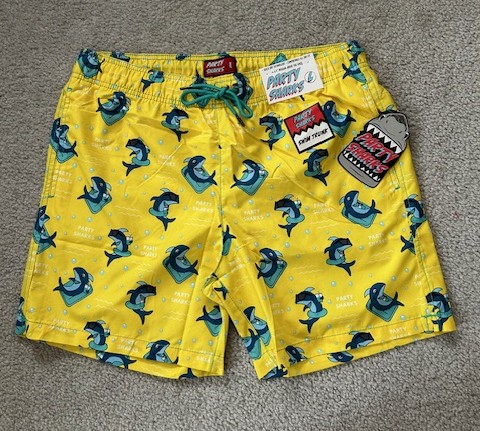 This item is YELLOW, Size "ADULT MEDIUM". It's a NEW "Party Sharks" brand Bathing Suit / Swim Trunks. Quick-dry technology, mesh lining, rear pocket with adhesive velcro to keep closed. Available for nationwide bidding. Item can be shipped to Winning Bidder or picked up for FREE in Enfield, CT after the Auction. Fun style, great fit!
