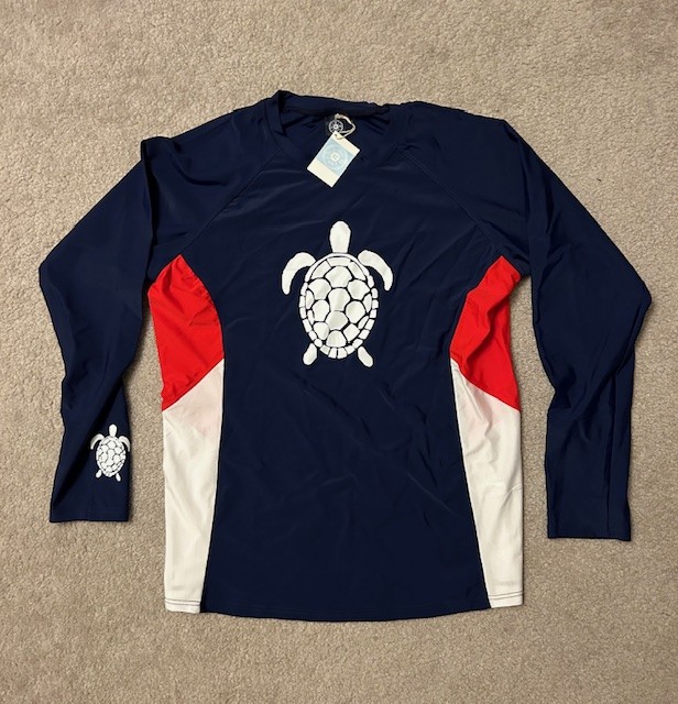Turtles! New with tags. Size Adult, SMALL (Navy Blue/Red).  (Also have "Adult Medium" in Auction (of this same Navy Blue Design - plus also in other colors - if you'd like to match with Family or Friends.). Unique and pretty!  Long-sleeve Rashguard / Sunshirt. Can be mailed nationwide to Winner (with insurance) or picked up for FREE in Enfield, CT.