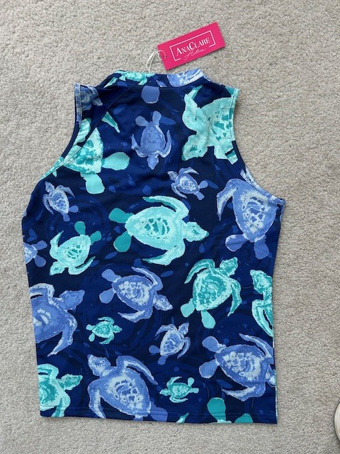 Turtles - Sun Shirt (SPF 50 Protection). Stylish and comfortable "Zip Front" Sleeveless Shirt. Navy blue / lavender / green - with adorable Turtles. (Brand new, with tags, $54 value - you can see it on the "AnaClare Active" Website.) This item is a Shirt, Size "Medium". (Equivalent to Women's Size 8 to 10.) Note: We also have other items in the Auction in similar Ocean-themed patterns (and in different sizes) to match with Family and Frineds. AnaClare is known for their easy-care apparel, with designs to empower and inspire women. So comfortable: wear for Dinner, Brunch, Golf, Beach, or Parties. This is their "Katie Top" in the sold-out "Turtle Style". Elegant and fun! 85% Polyester 15% Spandex, SPF-50 Sun Protection. Machine washable. Item can be shipped nationwide to Winning Bidder (with insurance) - or picked up for FREE in Enfield, Connecticut. Buy now and save for the Holidays!