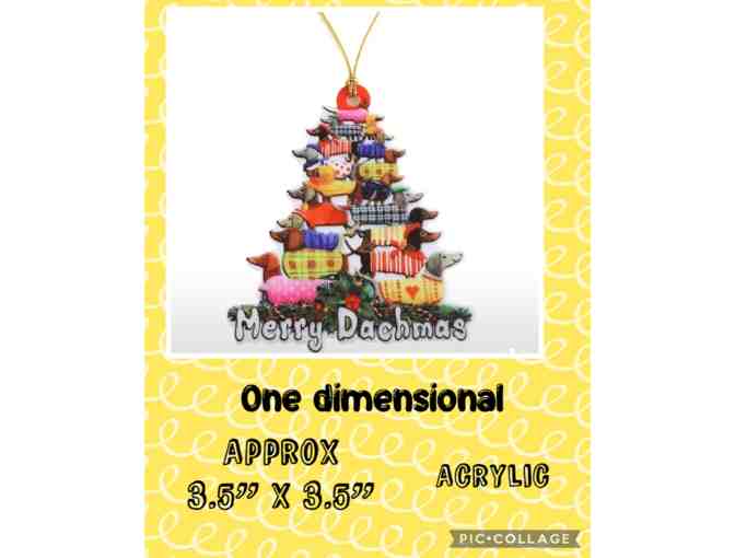 This is ONE DIMENSIONAL! Fun dachshund ornament. "Merry Dachmas" only reads from the front; the reverse is in reverse! Made of study plastic.