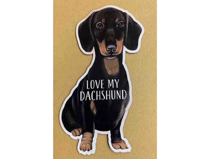 Check out this magnet!! A 4 1/4” tall, 2 ¼” wide flat, flexible die-cut magnet that says “Love my Dachshund.”