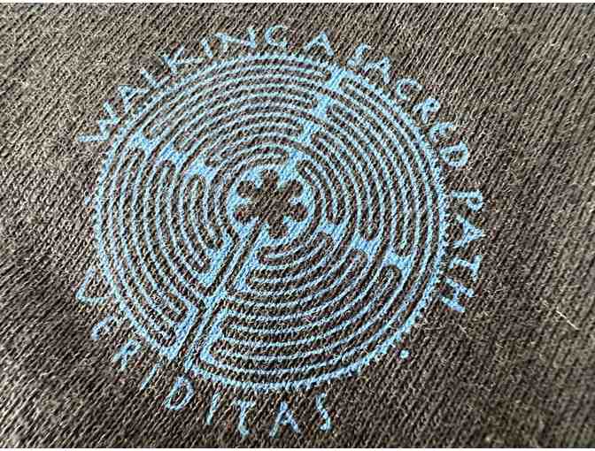 Black Long Sleeve T-shirt, sized 2 XL featuring a small blue Chartres labyrinth on the front with the words "Walking a Sacred Path" wrapped across the top, and "Veriditas" wrapped underneath.