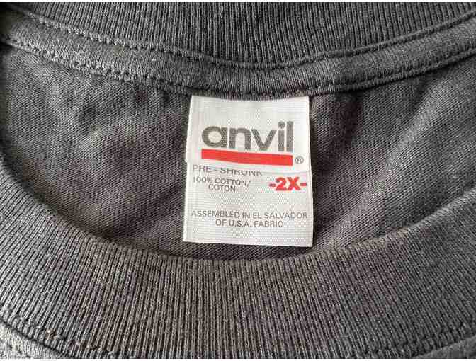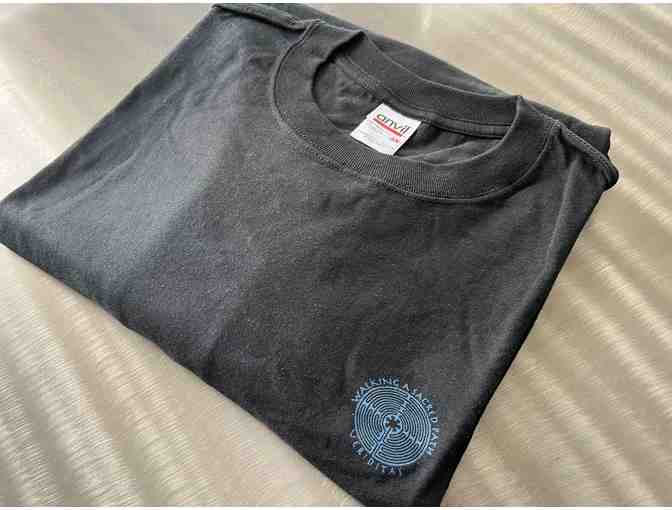 Black Short Sleeve T-shirt, sized 2 XL featuring a small blue Chartres labyrinth on the front with the words "Walking a Sacred Path" wrapped across the top, and "Veriditas" wrapped underneath.