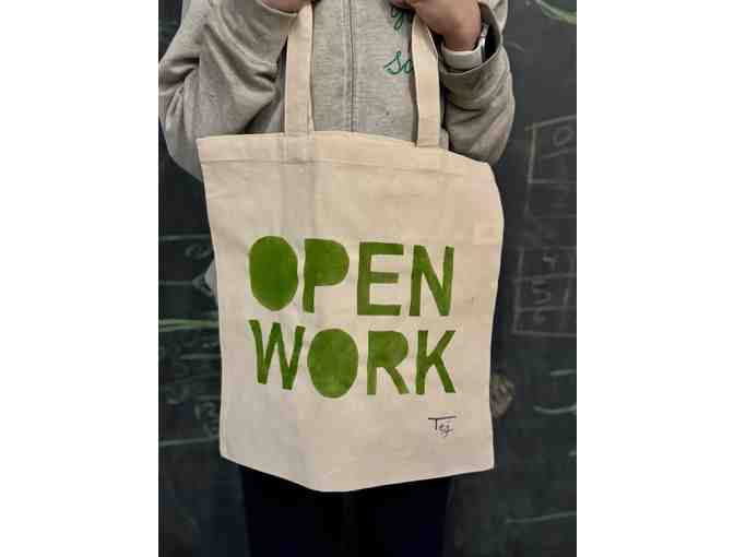 OPEN WORK stenciled canvas bag handmade by 7th grader Tej Abumrad