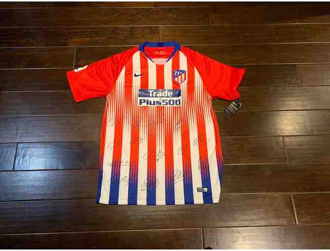 Athletico Madrid Team Autographed Soccer Jersey. Signatures include ANTONIO ADAN, GODIN, FILIPE LUIS, STEFAN SAVIC, LUCAS HERNANDEZ, GIMENEZ, THOMAS, KOKE, SAUL, GRIEZMANN, KALINIC, CORREA, DIEGO COSTA, SIMEONE. Comes with certificate of authenticity.