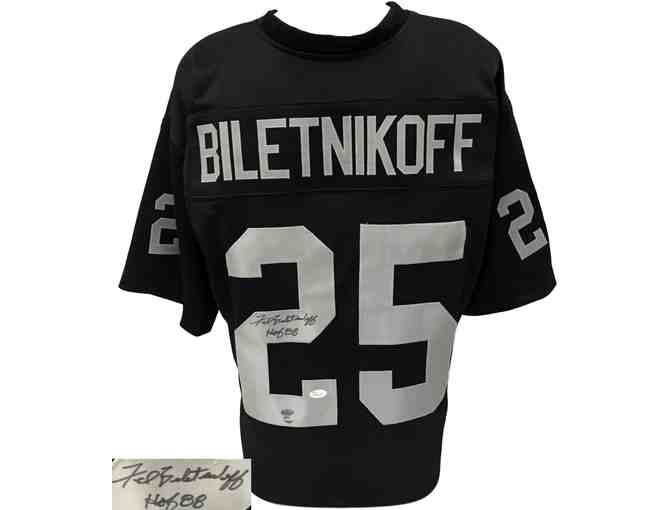 Custom on-field style jersey. Everything sewn on, size XL. Hand-signed by Fred Biletnikoff (HOF). The autograph includes an official James Spence Authentication (JSA) hologram and matching COA for authenticity purposes. The signing of this item was witnessed by JSA.