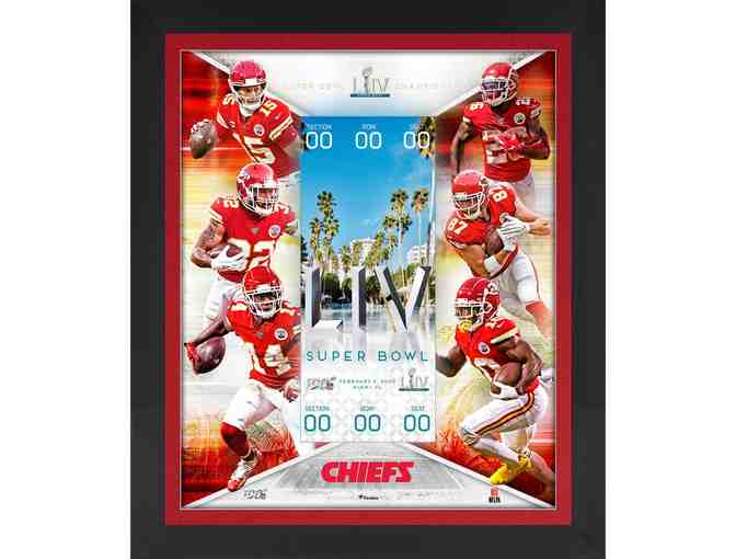 Commemorate Kansas City Chiefs as Super Bowl LIV Champions with this collage. Each piece features Super Bowl photographs and a replica ticket from their Super Bowl LIV victory. It comes double matted and framed in black wood with a decorative plate and Chiefs logo art. Officially licensed by the National Football League. Overall dimensions are 23" x 27" x 1".
