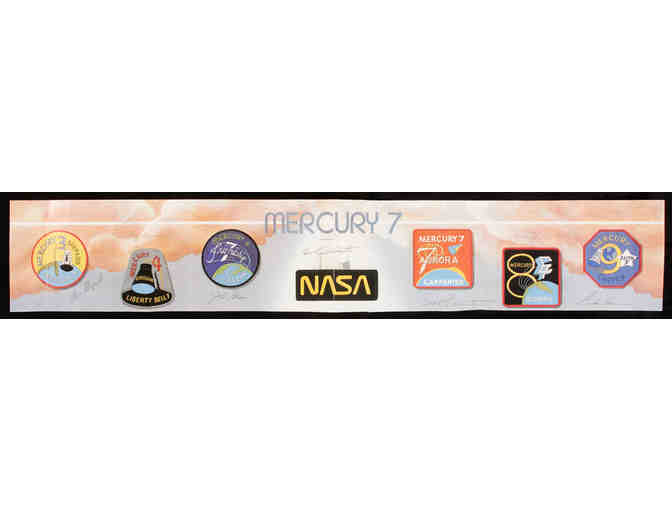 Mercury 7 Autographed Astronaut Signature Panel. Panel Autographed by John Glenn, Alan Shepard, Wally Schirra, Gordon Cooper, Deke Slayton, Scott Carpenter, and Betty Grissom (who signed by Gus). Measures 7" x 35". Comes with certificate of authenticity.