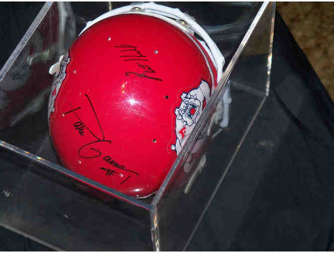 A really nice Fresno State mini helmet signed by RB Paris Gaines and 2000 Head Coach Pat Hill. The display case is included