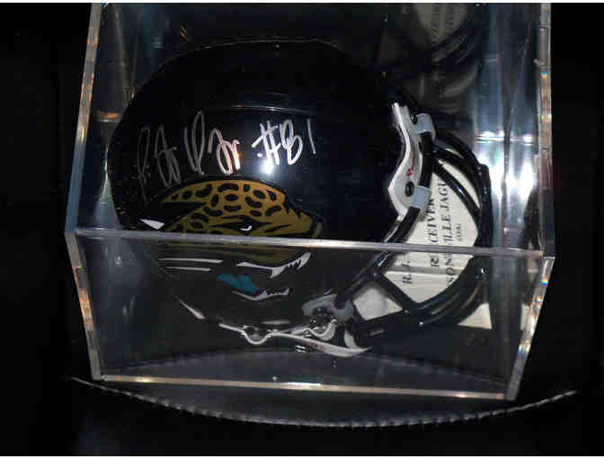 A great autographed Jacksonville Jags mini helmet - WR R. Jay Soward. Comes with a display case