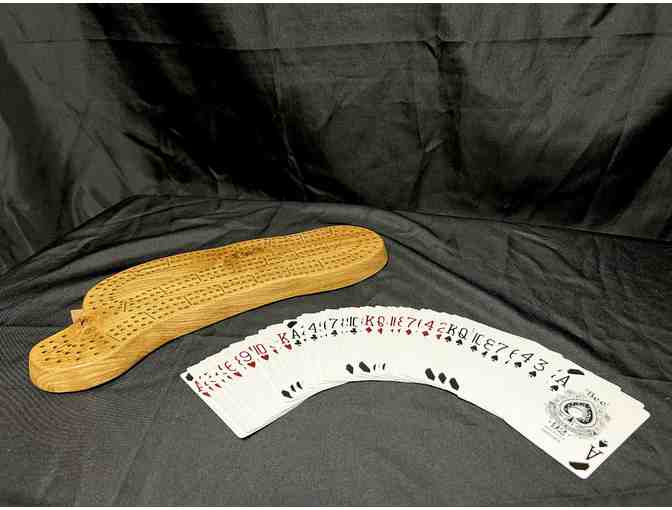 Douglas Workman is a carpentry specialist that has made this beautiful hand-made Cribbage board. Handcrafted pegs and casino-used cards are included.