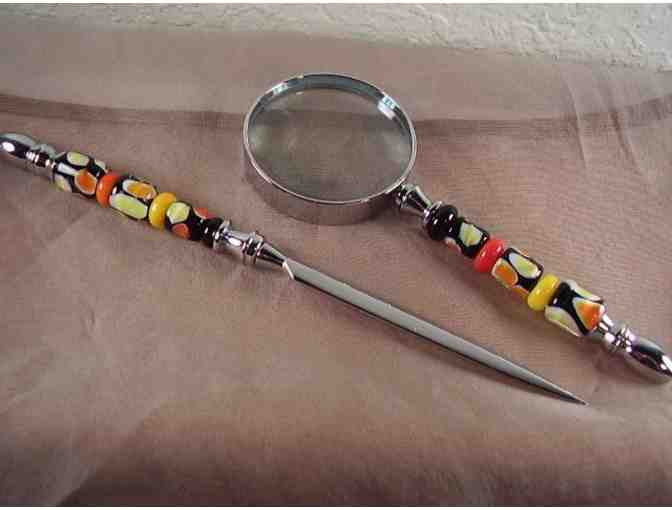 Clever glowing dots embellish this unique executive gift set including a magnifying glass and letter opener sure to show off your truly discriminating taste at home or at the office! Pens can be refilled with standard cartridges available at most office supply stores.