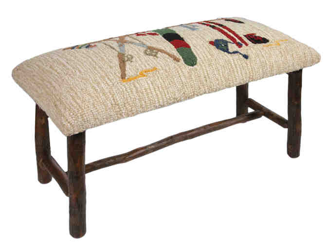 This hooked wool top bench depicts a rack of skis and snowboards along with a few other accessories put away after a day of fun in the snow.