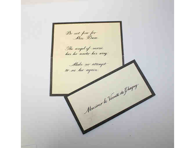 On April 16, 2023 the music of the night played for the final time on Broadway when The Phantom of Opera played its final performance. At the end of its Broadway run The Phantom of the Opera company donated some very special items that they have saved throughout their 35 year run. This is a stage used prop note from the Phantom to Raoul (Vicomte de Chagny). Because it was used on stage the note and envelope do have some creasing.