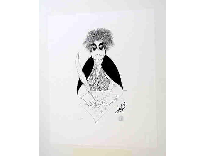 Mark Hamill, renowned for his role in Star Wars, showcased his dramatic acting skills by portraying Mozart in the Broadway play Amadeus. This iconic sketch by the legendary artist Al Hirschfeld features Hamill as Mozart. It was originally published in The New York Times Friday theater column on July 1, 1983. This limited-edition gicle print, generously autographed by Hamill, is printed on 15" x 18" hot press paper. It is part of an extremely limited edition, numbered, bears the official Hirschfeld Foundation embossed seal, and includes a Certificate of Authenticity directly from the Al Hirschfeld Foundation.