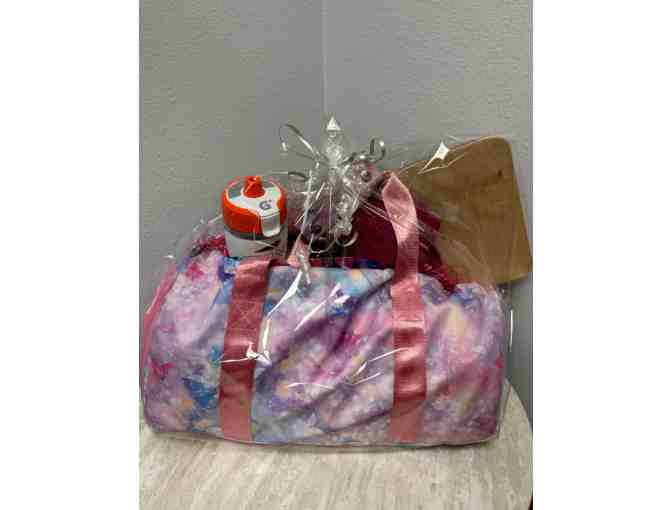 Don’t forget the swag bag, with essentials like hair ties and KT tape as well as an easy, on-the-go handstand board to protect your tumbler’s hands from the floor for all of their random location handstand needs.