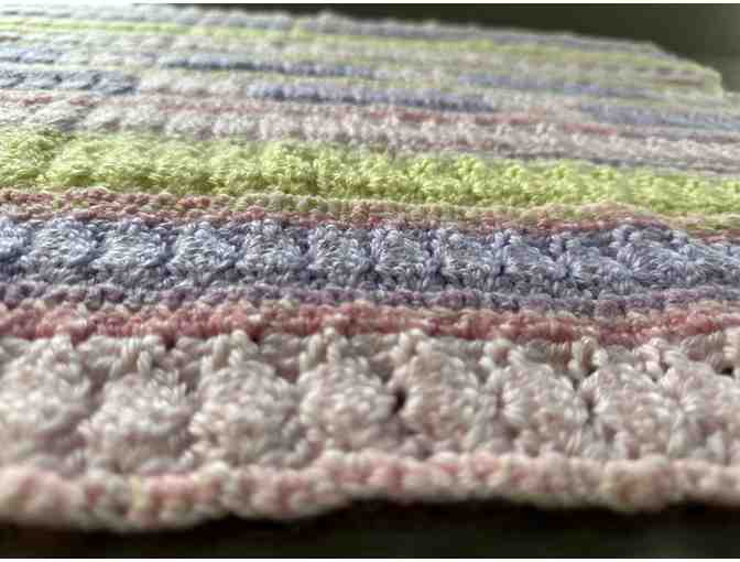 This Baby Afghan was generously donated to our auction by Pat Richards.  The beautiful patterns are created in pastel pink, yellow, and lavender with hints of green and white.  Hand-crocheted with love, using soft baby yarn.  Machine Washable and Druable.  Details of the material used and care instructions included.