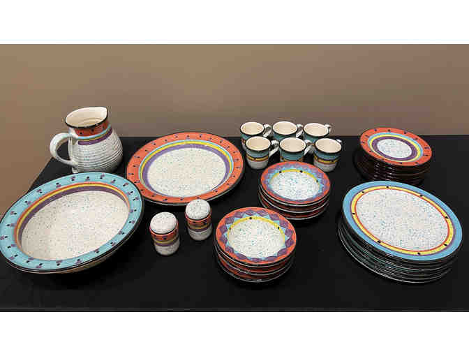 6 dinner plates, 6 bowls, 6 sm. plates, 6 mugs, 1 lg. serving bowl, 1 lg. serving plate, 1 pitcher, set of salt and pepper shakers.