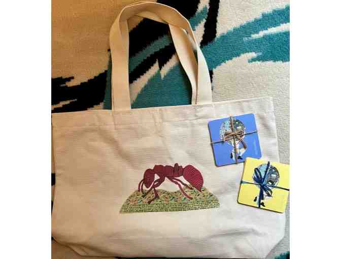 Rev. Howard Finster Ant image on canvas tote bag (new) and eight cardboard coasters with Finster image.