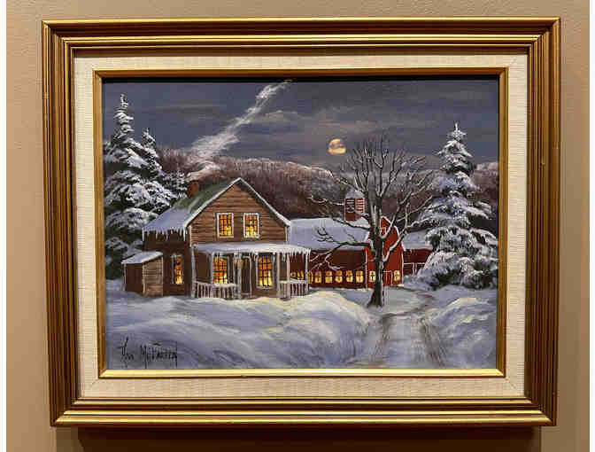 Anne McFarren, from Rutland VT, oil painting of a snowy Vermont night.