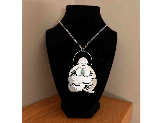 Sterling silver vintage Buddha pendant with turquoise stone on a 33" silver rolo chain. Makers mark reads MJI.