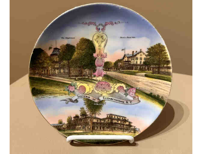Souvenir plate of Elizabethtown, NY with images of the Windsor, Deer's Head Inn, and Maplewood. Some slight wear on the edges. Approx 5"