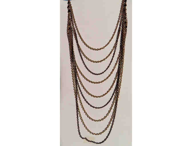 Identical to lot 138- Silver chain necklace measures 20 inches long with 1 silver chain, 12 alternating strands of silver and black chain, black crystal accents, and silver clasp.