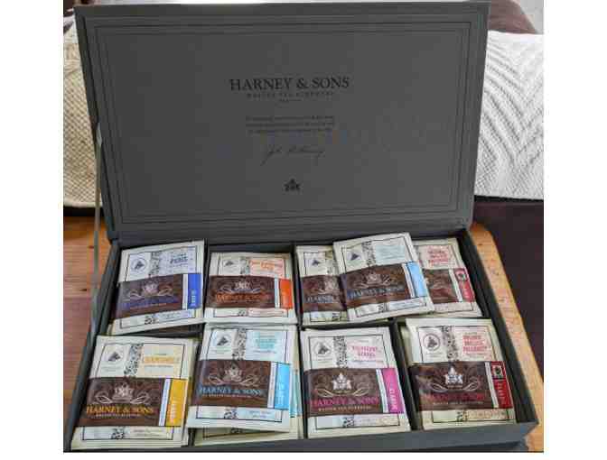 Harney Tea Sampler in a grey tea chest with a variety of 32 teas.