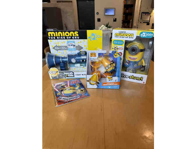 Minions Gift Set 2: value $100. Includes Minions: Babble Otto Large Interactive Toy with 20+ Sounds & Phrases, Launch and Crash Mega Minion Gus, Mega Minions kids board book, Minions The Rise Of Gru Fart N Fire Blaster.
