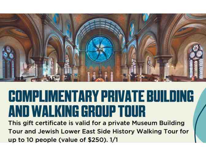 You are bidding on a voucher good for a walking tour of up to 10 people. This gift certificate is valid for a private Museum Building Tour and Jewish Lower East Side History Walking Tour.