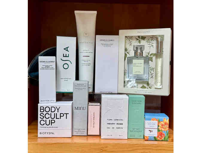 Henry Rose -Flora Carnivora EDP $120, Grown Alchemist Skin Renewal Serum $72, Doctor Rogers Night Repair Treatment $98, Minu Brightening Sunscreen $58, Grown Alchemist Gental Cleanser $38, Maison Louis Marie Home and Away gift set No.04 $98, BIOTYSPA Body Sculpt Cup $59, OSEA Sea Mist $38, Innerscense Hair Smoothing Cream $28, Westman Atelier Lit Up Highlight stick $48, Royal Tulip Moisturizing Nectar $30, Credo Make Up Bag. + A FREE service (makeup application or mini facial) at Credo on Abbot Kinney $50
