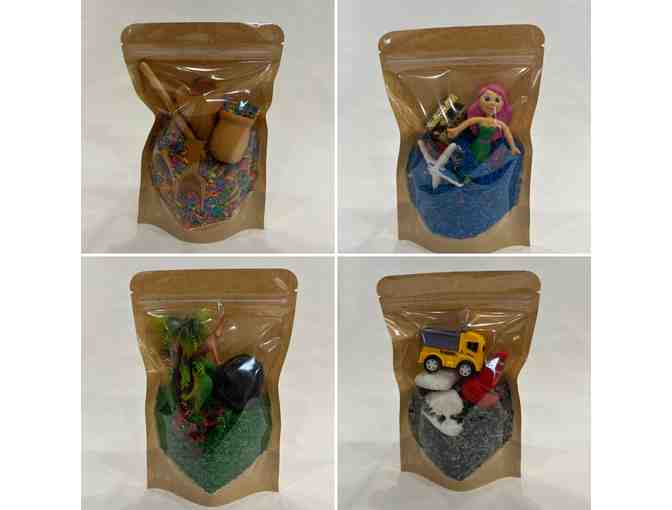 The winning bidder will receive 10 Party Favor Kits (good for 10 children) and will receive a 10% discount on additional Favor Kits for the same party. Winning bidder can choose from the four kits pictured: Wooden Tools, Dinosaur Adventure, Construction Zone or Mermaid Treasure. Party Favor Kit includes: 1 Bag, Rice, Themed Tools. Rice color is customizable.