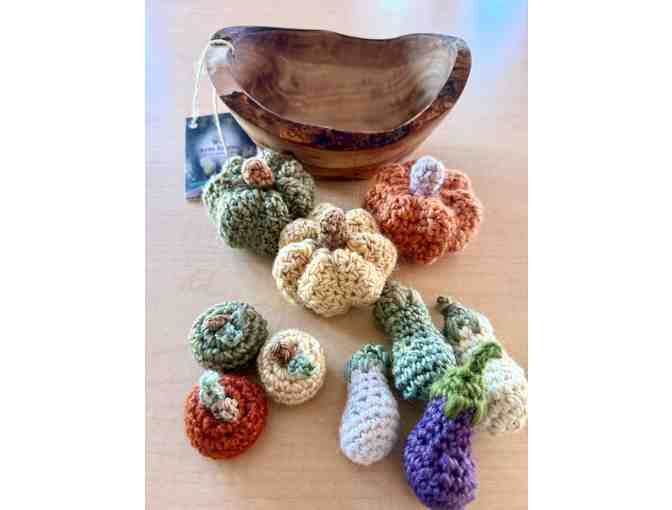Hand Crocheted Vegetables and Fruit in an Olive Tree Wooden Bowl