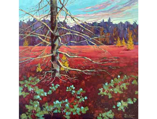 This painting is of La Mer Bleue in the fall when the blueberry patches turn red. I did many paintings of this beautiful place in the suburbs of Ottawa. I use acrylic paint because it allows me to work quickly putting down several layers of colour to achieve my vision.