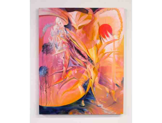 Mutation by Degrees questions the separation between body and environment. It was painted from an assemblage created in my studio combining plants, objects, and the projected image of my figure. My body merges with the surrounding objects and materials transforming into new, otherworldly forms through its interactions with its environment.