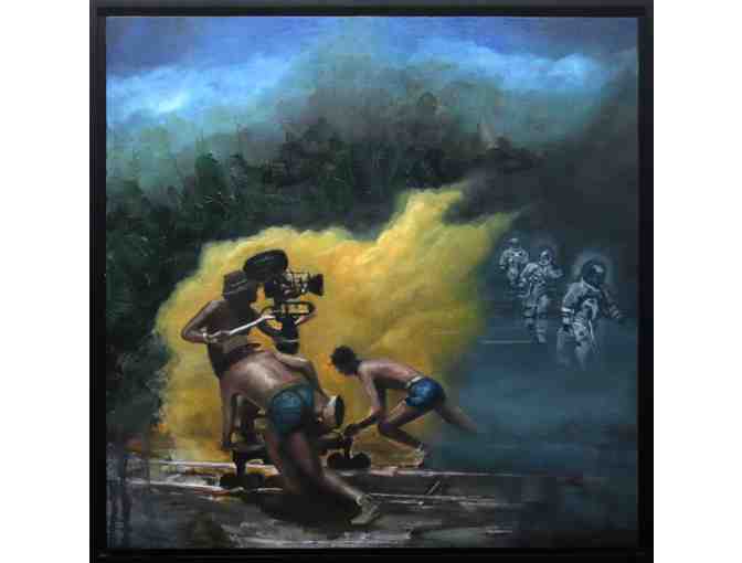 I was inspired to create this painting after an unexpected QAnon AirBNB experience in Arizona. The scene references Francis Ford Coppola's 1979 film, Apocalypse now, and an absurd conspiracy theory that film director Stanley Kubrick helped NASA fake the historic footage of its six successful moon landings.