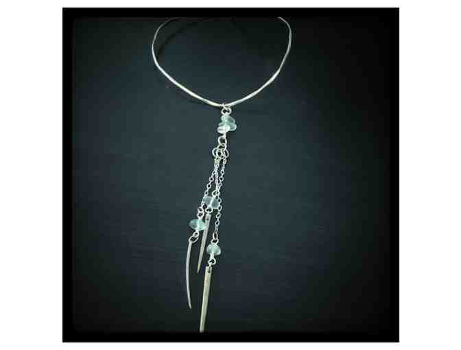 This is an adjustable silver collar with tines hanging to cleavage. Soft-forging of repurposed silverware fork tines, incorporating sea glass. A perfect summer accessory.