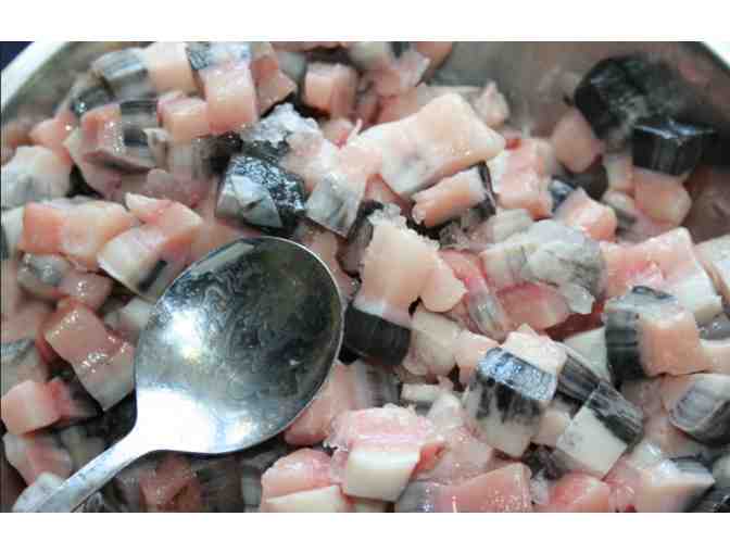 This image was taken during the opening of the Larga Baffin medical residence. The residence is for patients that come down for medical appointments from the Baffin region of Nunavut. It speaks to Inuit Country Food in an urban setting, and it also conveys the message of being humble, (Inuit are very humble). Even if someone is perceived as being born with a silver spoon, we must always remain humble and not get some big feeling.