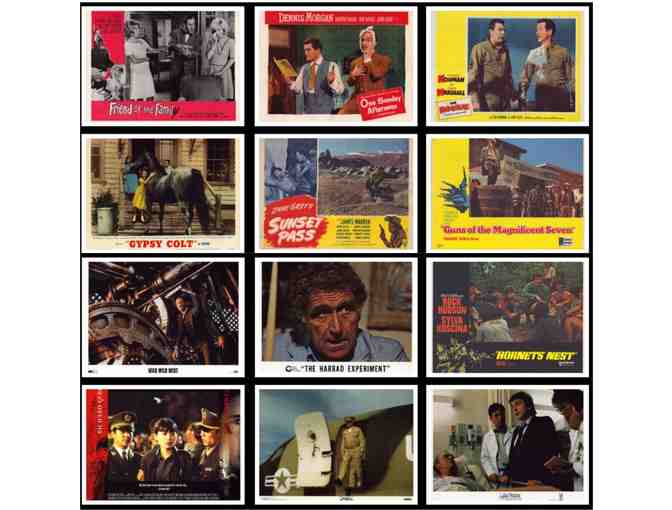 DESCRIPTION: This is a lot of TWELVE different theater used lobby cards from the 1940s to 1990s, each measuring approximately 11x14" on card stock. These are all parts of sets with no duplicates.
