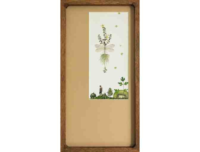 Kiwi With Lacewing, 2024, hand cut collage with found images on watercolour paper, custom mat with walnut frame, 8.25 x 15.75 cm