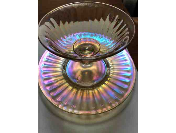 Marigold iridescent carnival glass dessert dishes with plates – made in fused glass from 1930s to mid-century modern. Vintage.