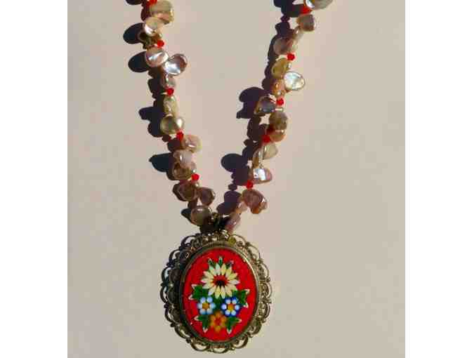 Necklace measures 11 inches long with large oval Italian micro mosaic pendant, flat pearls, and orange crystals.