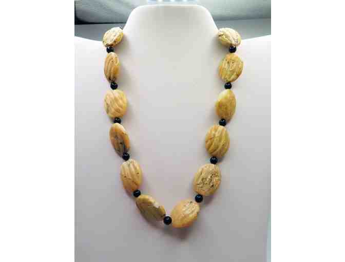 Necklace measures 8 inches long with cream colored oval stones, black glass beads, and silver clasp.